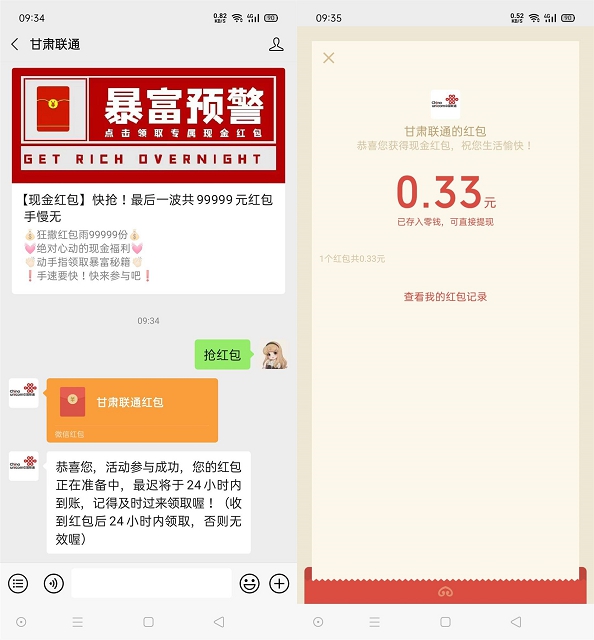 甘肃联通参与活动简单抽取随机现金红包 亲测中0.33