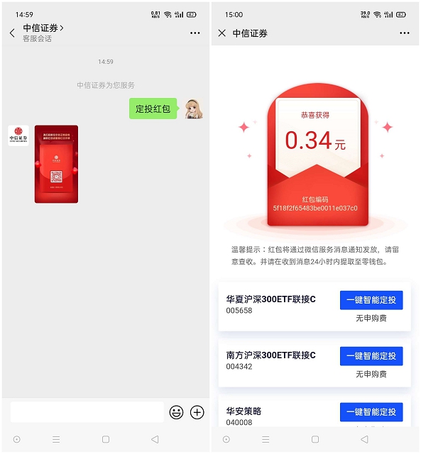 新一期中信证券智能定投领随机现金红包 亲测中0.34