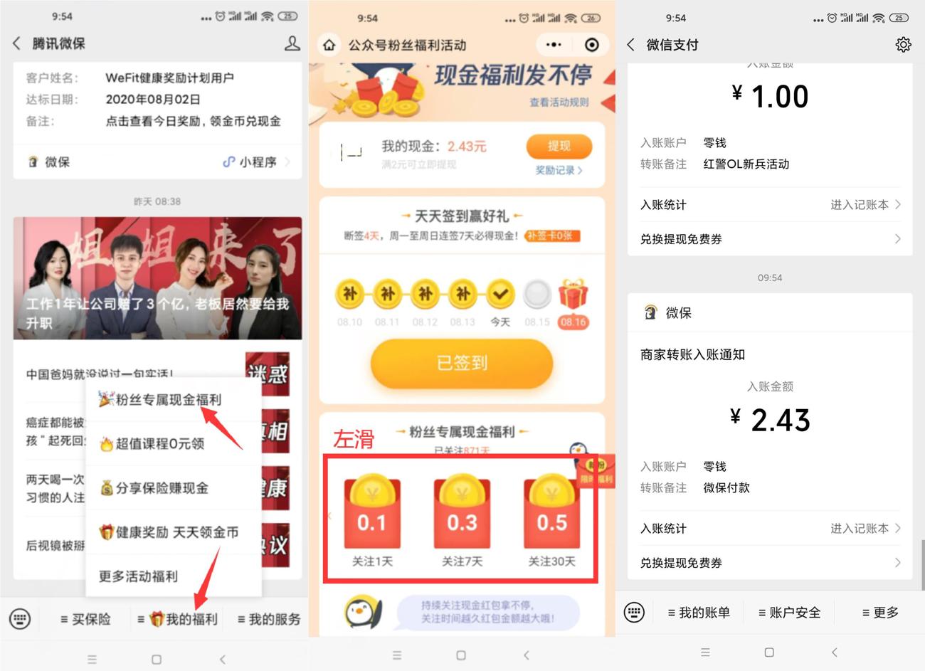 微信关注“腾讯微保”->进去后签到->然后点粉丝专属福利->左滑->全部拆开红包->然后回到上面提现