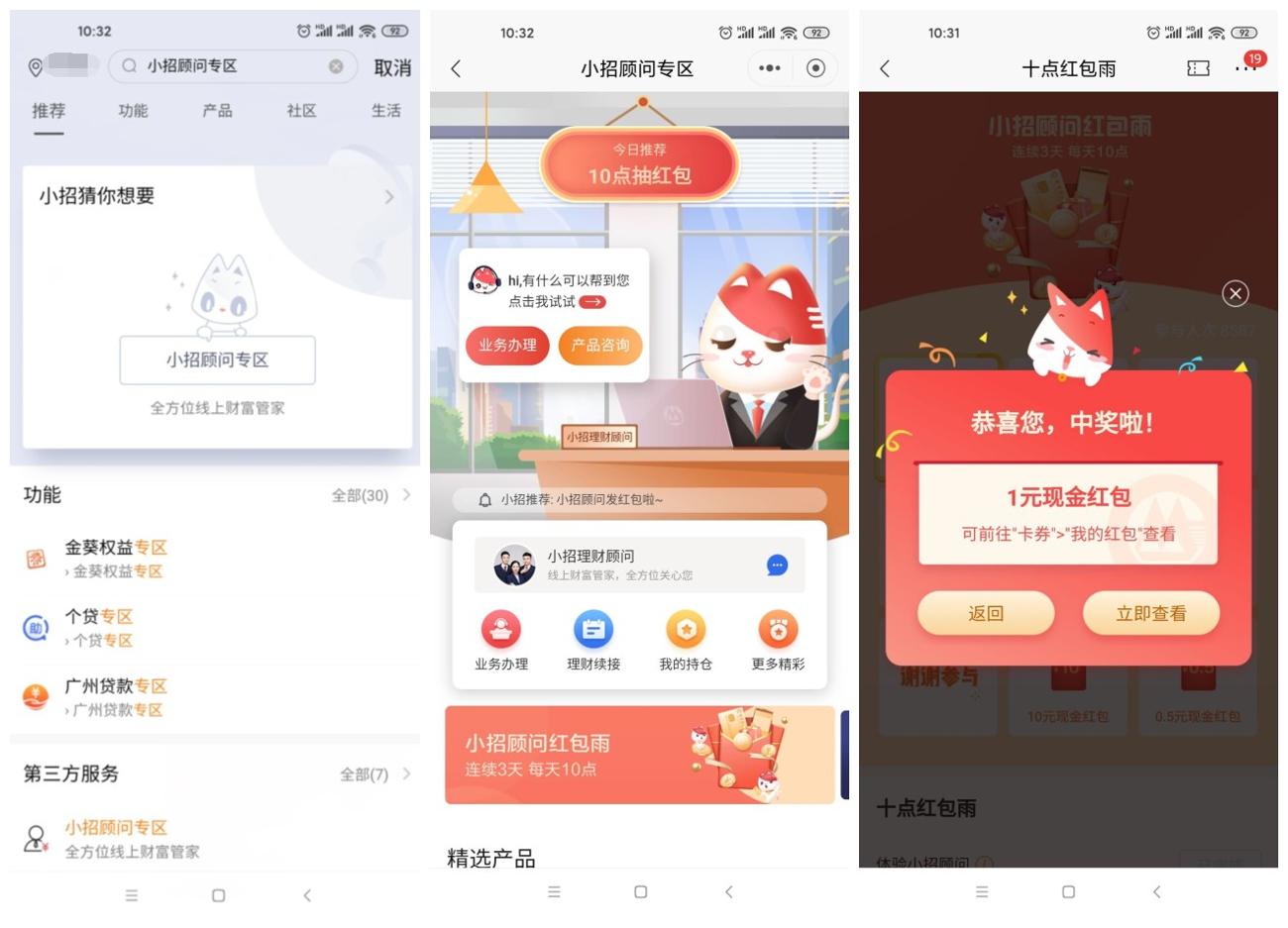 招商银行APP搜索“小招顾问专区”->点进去后点中间图片->红包雨->连续参加3天->每天10点来抽包