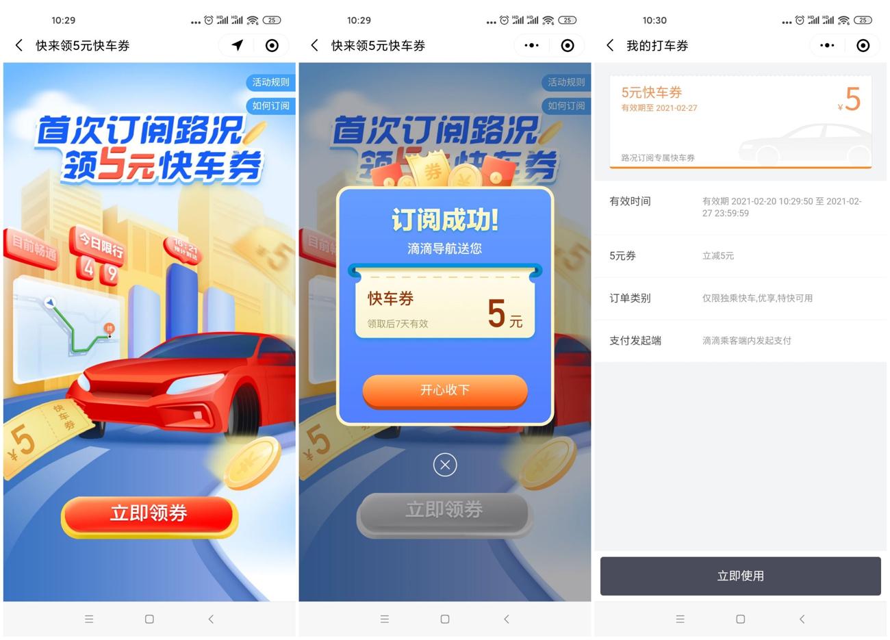 滴滴出行免费领取5元快车券
