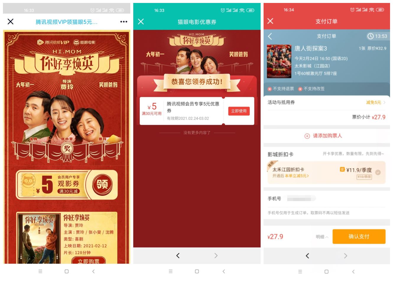 无需腾讯视频会员也可以领取!领取成功后->在猫眼APP、美团APP即可查看使用->有效期7天