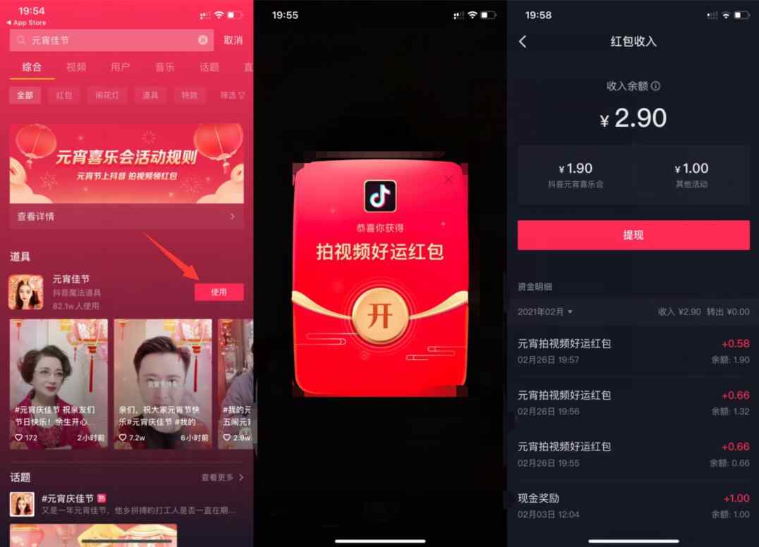 抖音老用户抽1~5元红包,抖音APP分别搜索搜索“元宵佳节”“元宵剪宫灯”“新春萌漫->点使用->拍3次视频->随便几秒就行发布成功后就可以抽3次红包!