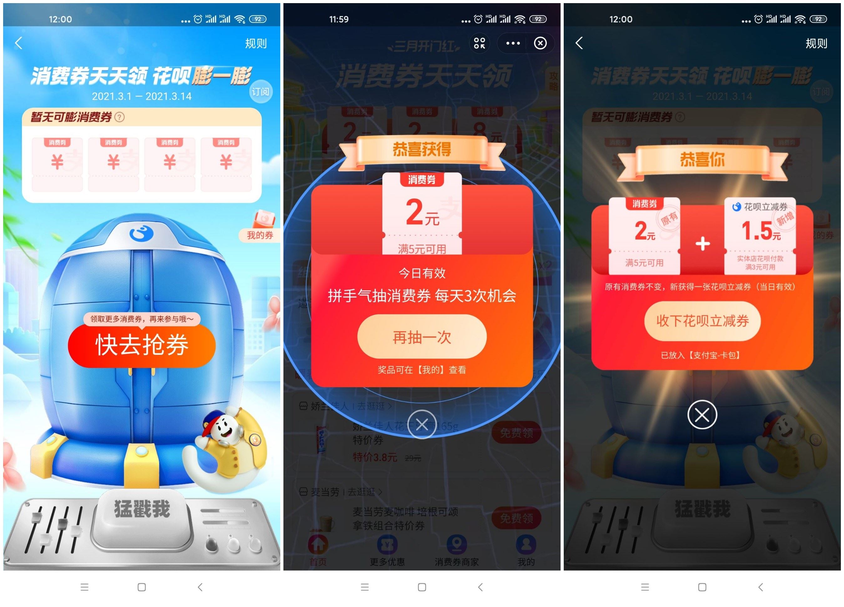 1、支付宝扫码进入活动->点快去抢券->然后点右侧边抽奖三次消费券->抽中后返回活动
