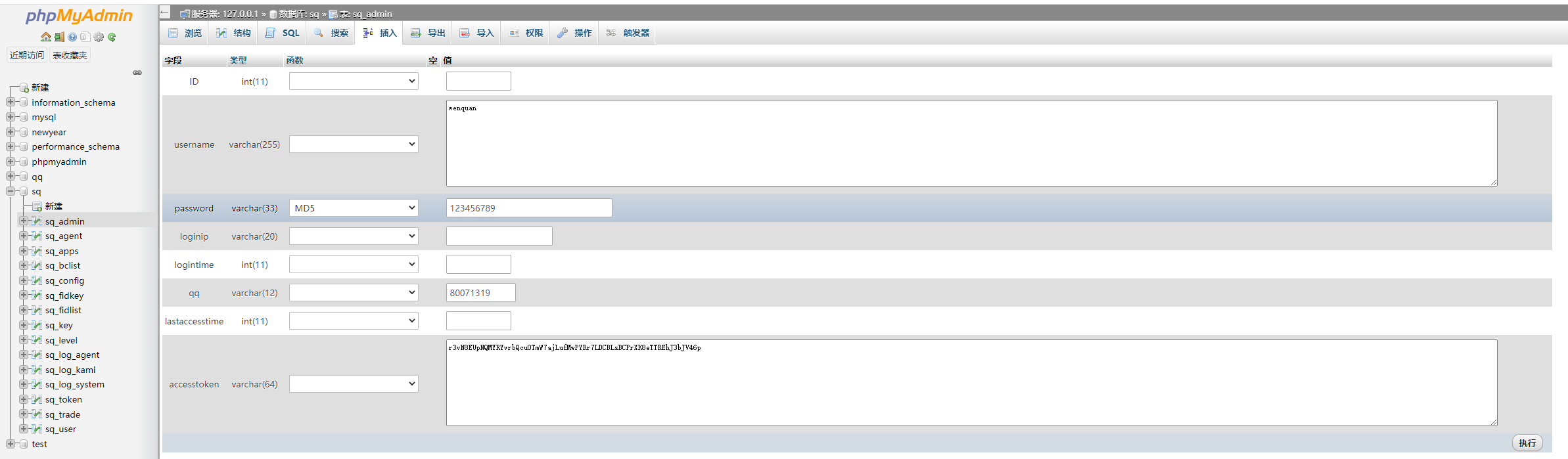 INSERT INTO sq_admin (ID, username, password, loginip, logintime, qq, lastaccesstime, accesstoken) VALUES (NULL, ‘温泉’, MD5(‘123456789’), ”, unix_timestamp(now()) , ‘80071319’, unix_timestamp(now()), ‘JjYBHCBSNeuoNnkTVRCf5EENhZWDcolJOh7MQlmV9pn4S4p4SZFHJaSH75MBK3OZ’);