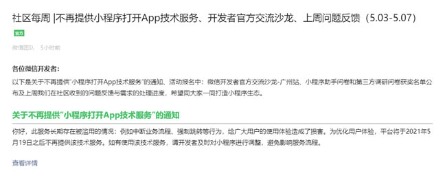 毕竟有些活动就需要是微信打开才能参与的,但是微信官方今日发布了关于不再提供“小程序打开APP技术服务”的公告