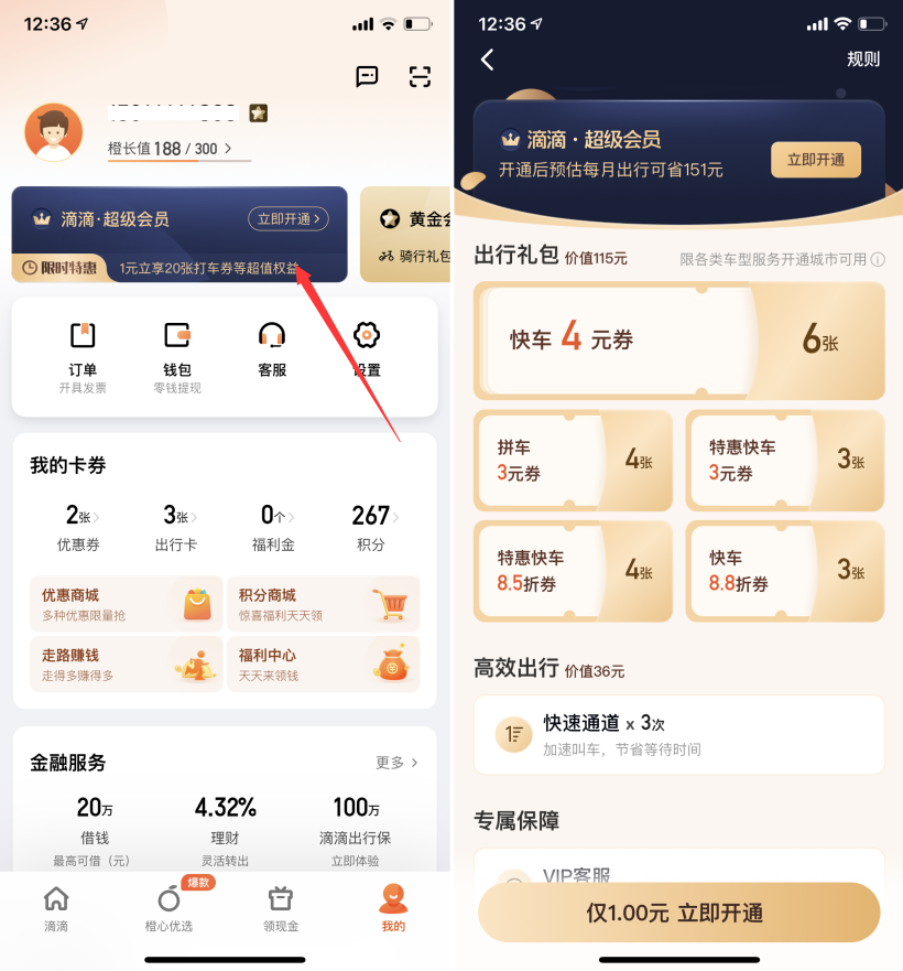 打开滴滴出行APP进入我的--立即开通超级会员,支付1元可获得115元出行礼包.