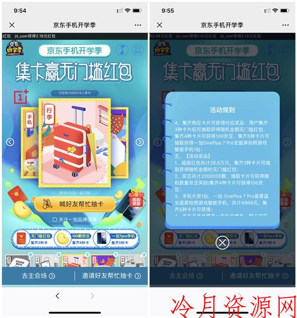 集齐3种卡可以获得无门槛红包,4种卡可以获得100京豆,5种卡可以抽一加手机!