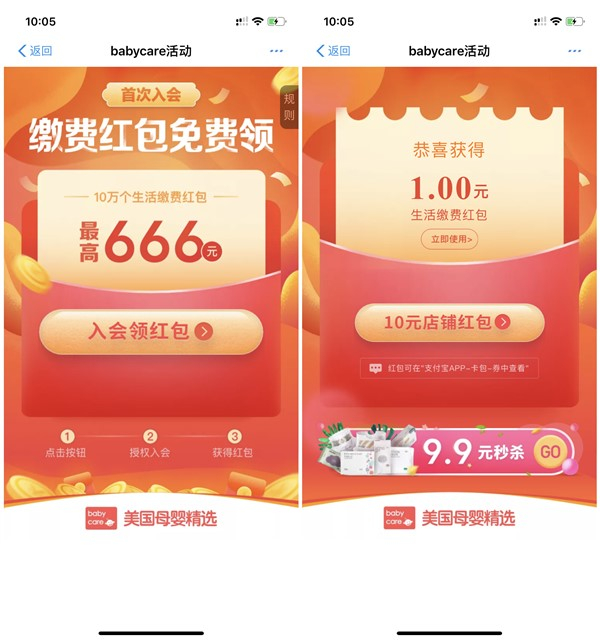 支付宝首次加入babycare会员抽666元缴费红包 活动必中