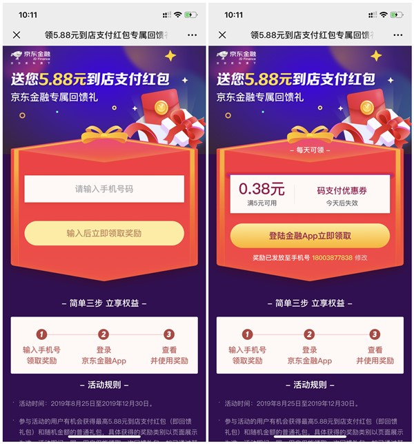京东金融专属回馈礼领取0.38-5.88元到店支付红包 可套现