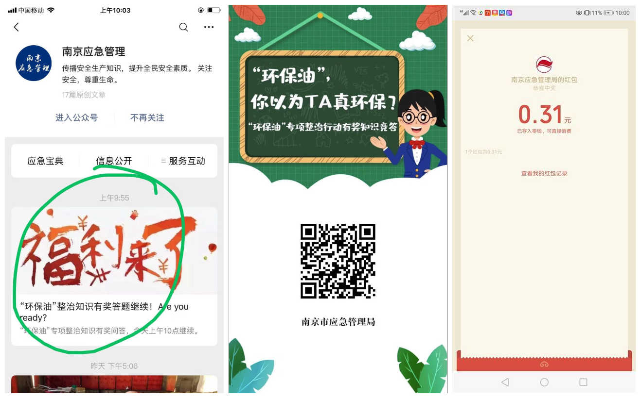 微信关注公众号:南京应急管理,历史一进去,扫码答题,4对3抽红包,红包秒推