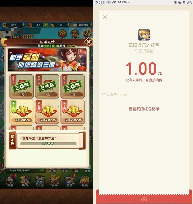 活动介绍:简单随便玩一下游戏,首先点击游戏左上角新手狂欢参与活动,然后点击征战模式赚金币。达到要求后新用户第一天可以领取1元,然后第二天又可以领两元。最高领撸64元红包秒到。