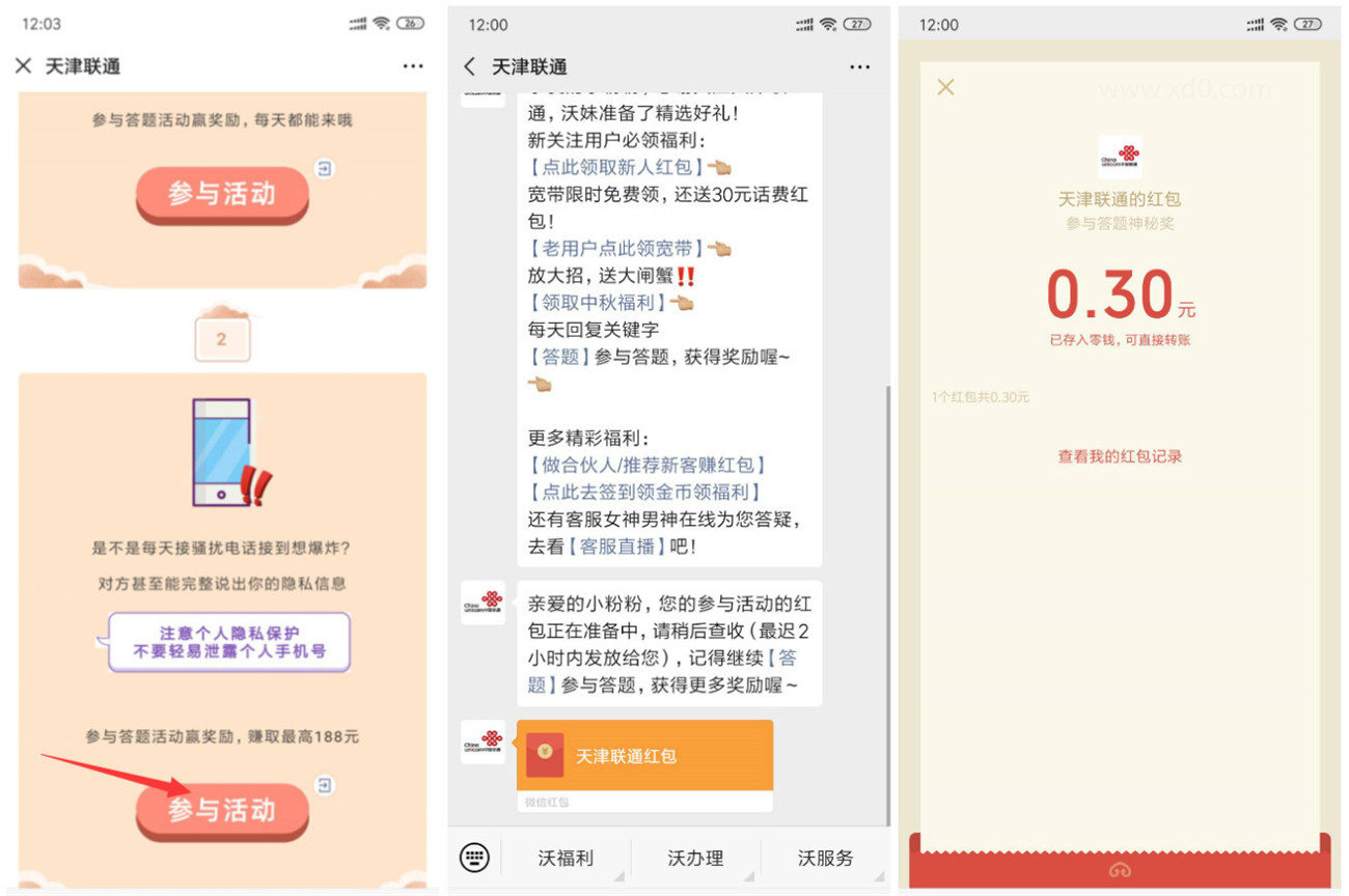 微信扫码点参与活动->进去后按照提示关注->貌似无需答题直接推0.3包->没推就重新去点下开始答题