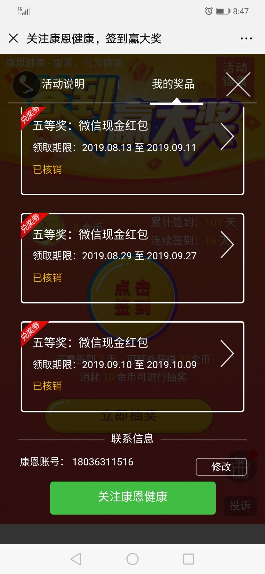 扫码关注康恩健康公众号,活动大厅—— 签到抽奖。高几率抽中1~2元红包。秒到账!!