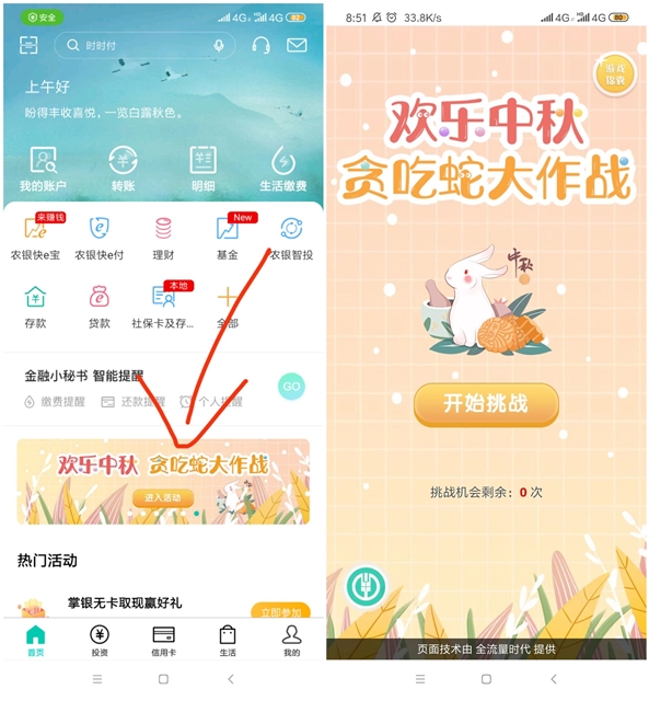 手机下载中国农业银行手机APP 下载以后首页进入“欢乐中秋 贪吃蛇大作战”玩游戏赢手机话费