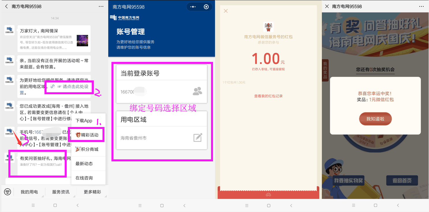 微信关注:南方电网95598,进菜单栏精彩活动,点击推文进小程序绑定号码,选择海南儋州,然后再次进精彩活动,进推文答题抽奖,大水非必中!重复答题5次机会!答案是D B A C B D