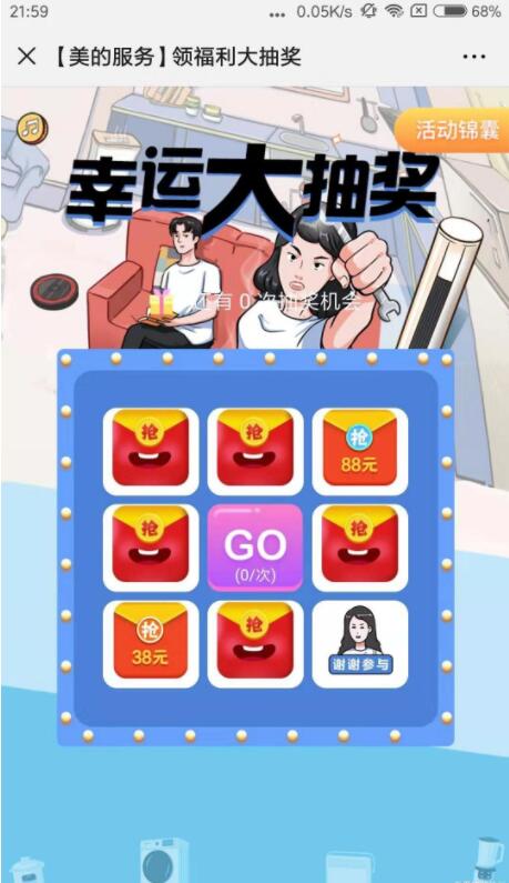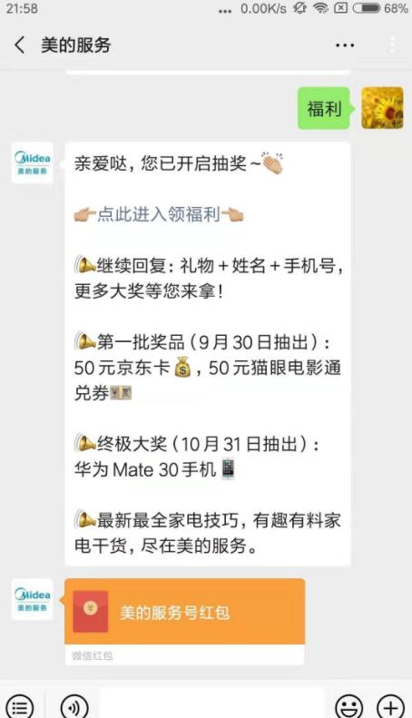 微信关注 美的服务》》发送信息 福利 》》点击推送的信息领福利,本人抽中现金红包0.3元,秒到账。有大包88元现金红包。