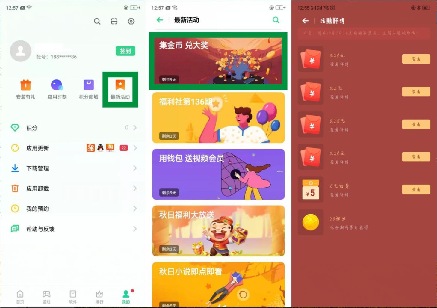 OPPO软件商店>我的>最新活动>集金币 兑大奖>进去摇一摇-获取免费机会