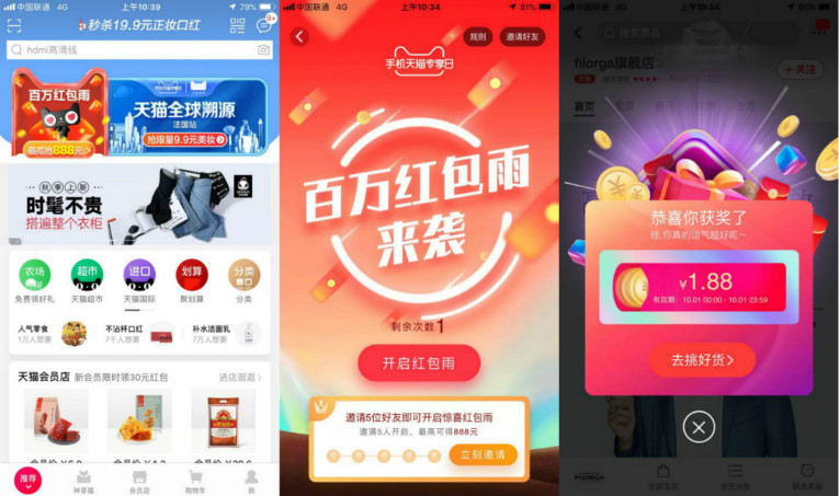 打开天猫APP抽红包->首页红包雨->抽红包->亲测1.88元