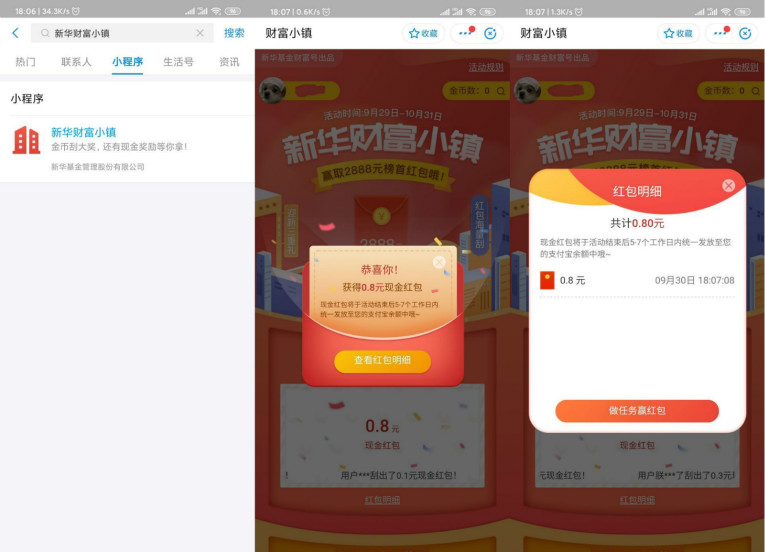 打开支付宝首页搜索小程序“新华财富小镇”