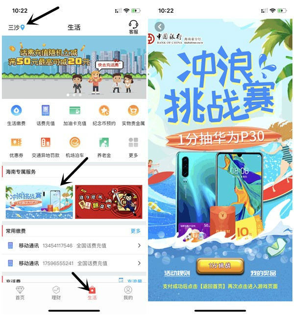 1.中国银行APP->底部->生活-左上角改->海南->任意地区>下拉页面左边