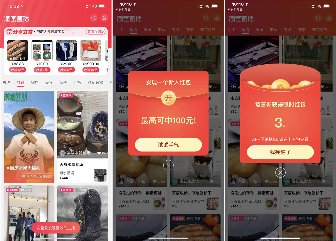 各大商店下载“淘宝直播”登陆后自动弹窗新人红包,必得3元无门槛红包!