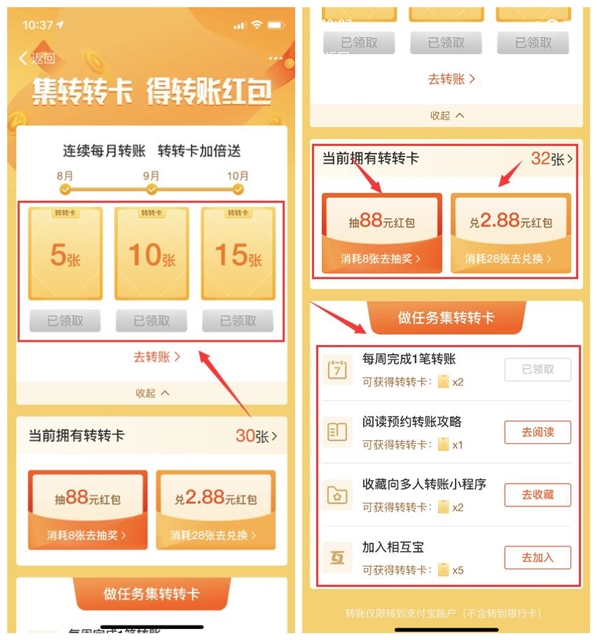 支付宝集转转卡 抽奖88元红包 抢兑2.88元红包
