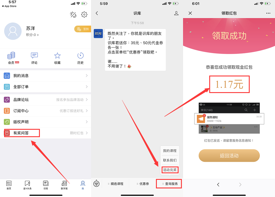 微信关注公众号“识库”->右三活动兑奖->刮奖->复制兑换码发给公众号->亲测秒到1.17!