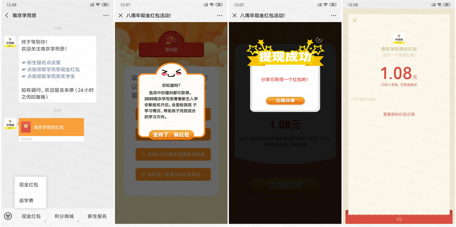 微信关注“南京学而思”->点菜单栏左下角->红包->进去答题->四题全对抽包
