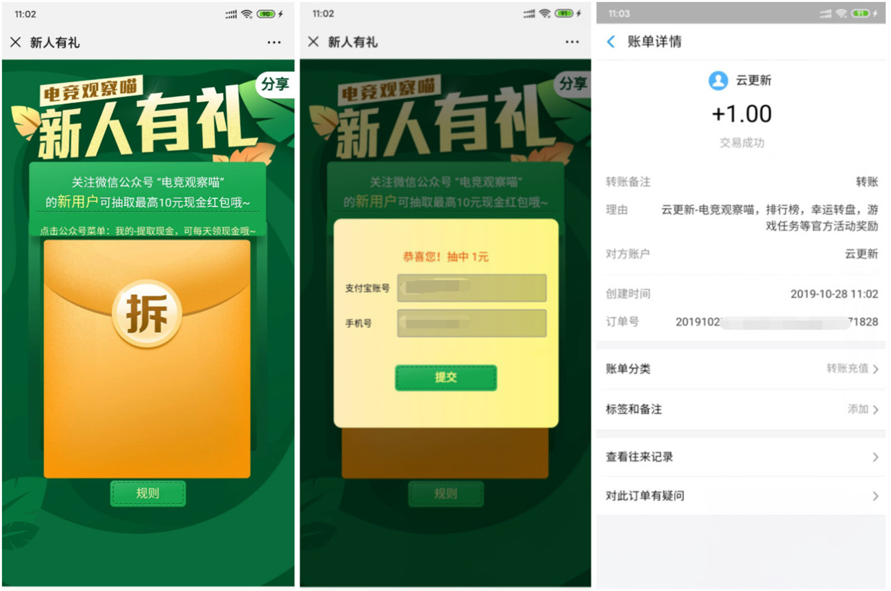 微信搜索公众号“电竞观察喵”->中间菜单栏->新人红包->进去抽奖->亲测中1元秒到