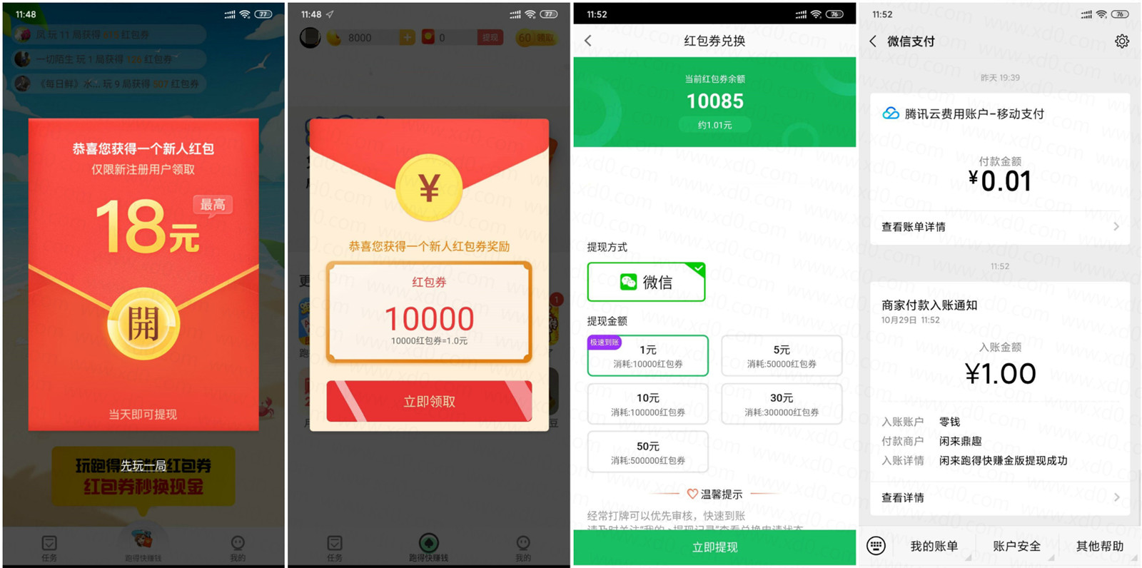 弹窗领取红包->开始游戏->赢1把就返回主页->提现->1元秒到->撸完卸载完事
