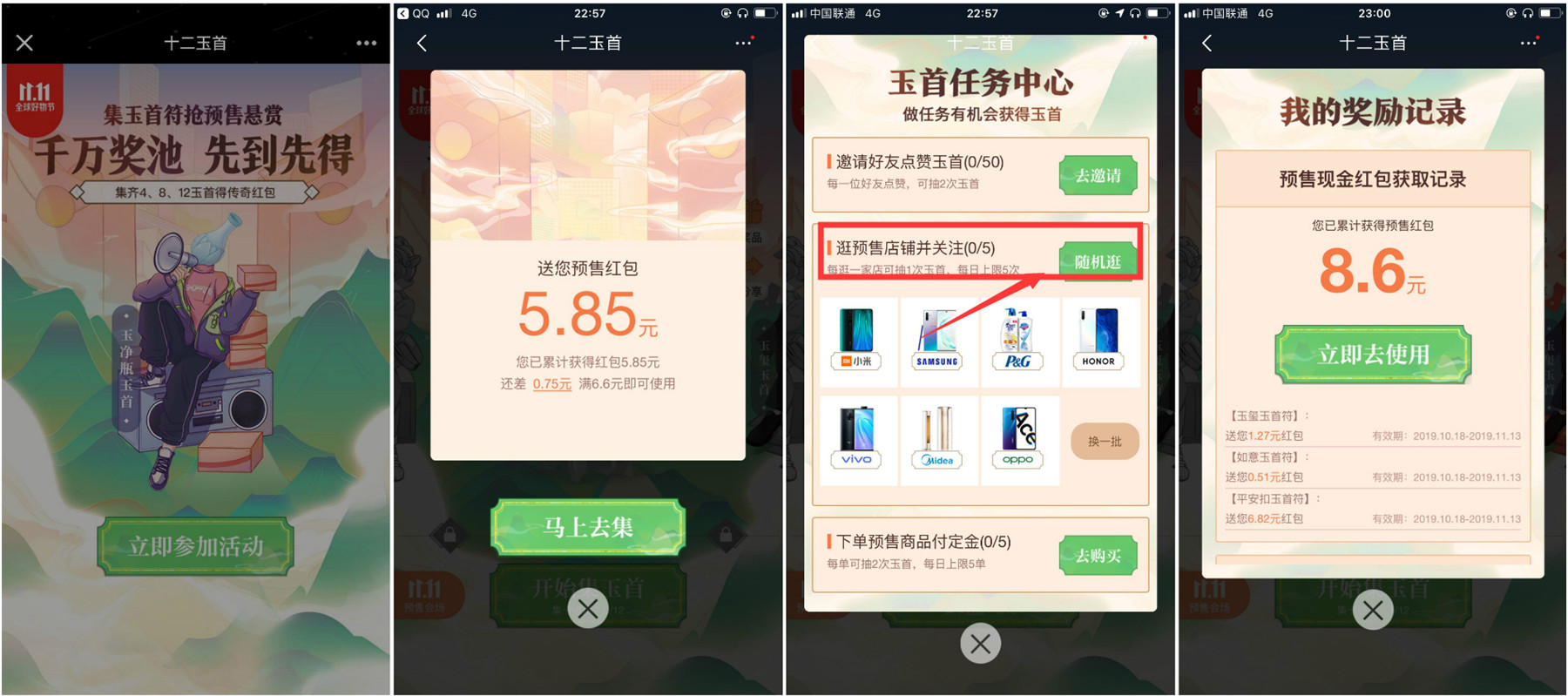 打开:https://url.cn/5Cpbsd4 点击“开始集玉”首次会拆开一个红包->然后点随机逛