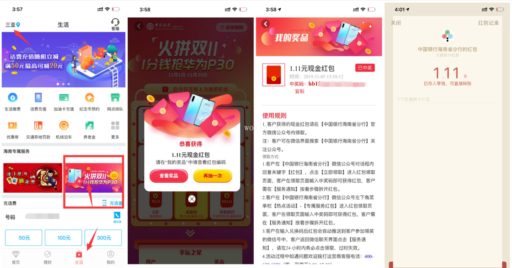 2.右侧边->火拼双11->支付1分抽奖->抽中按照提示兑换即可