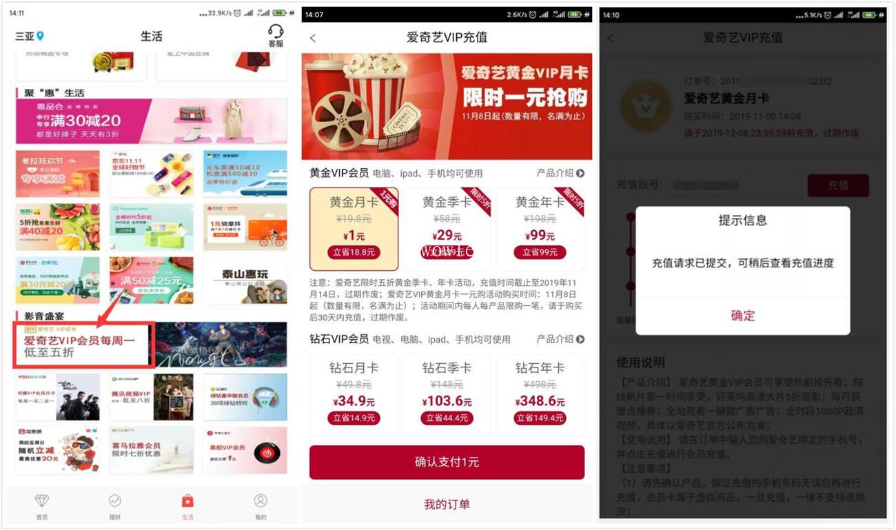 1.打开中国银行APP->生活->下拉到底点->左侧边->“爱奇艺VIP会员每周一”