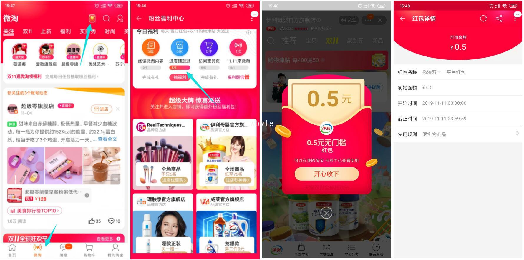 手机淘宝->底部->微淘->右上角红包->进去后->进店铺逛逛