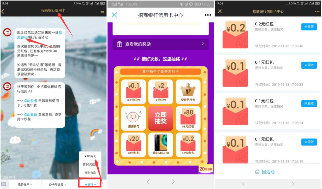 QQ公众号搜索关注【招商银行信用卡】->点推文->戳此参与->没有推文点右下角88好礼