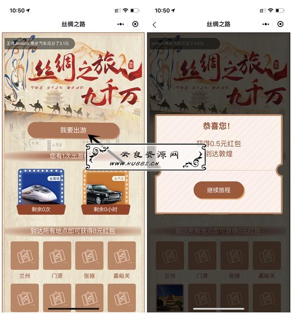 微信搜索:丝绸路上赢大奖 小程序进入,每人有1次出游机会,点击我要出游,选择汽车出行支付1分钱即可抽奖!