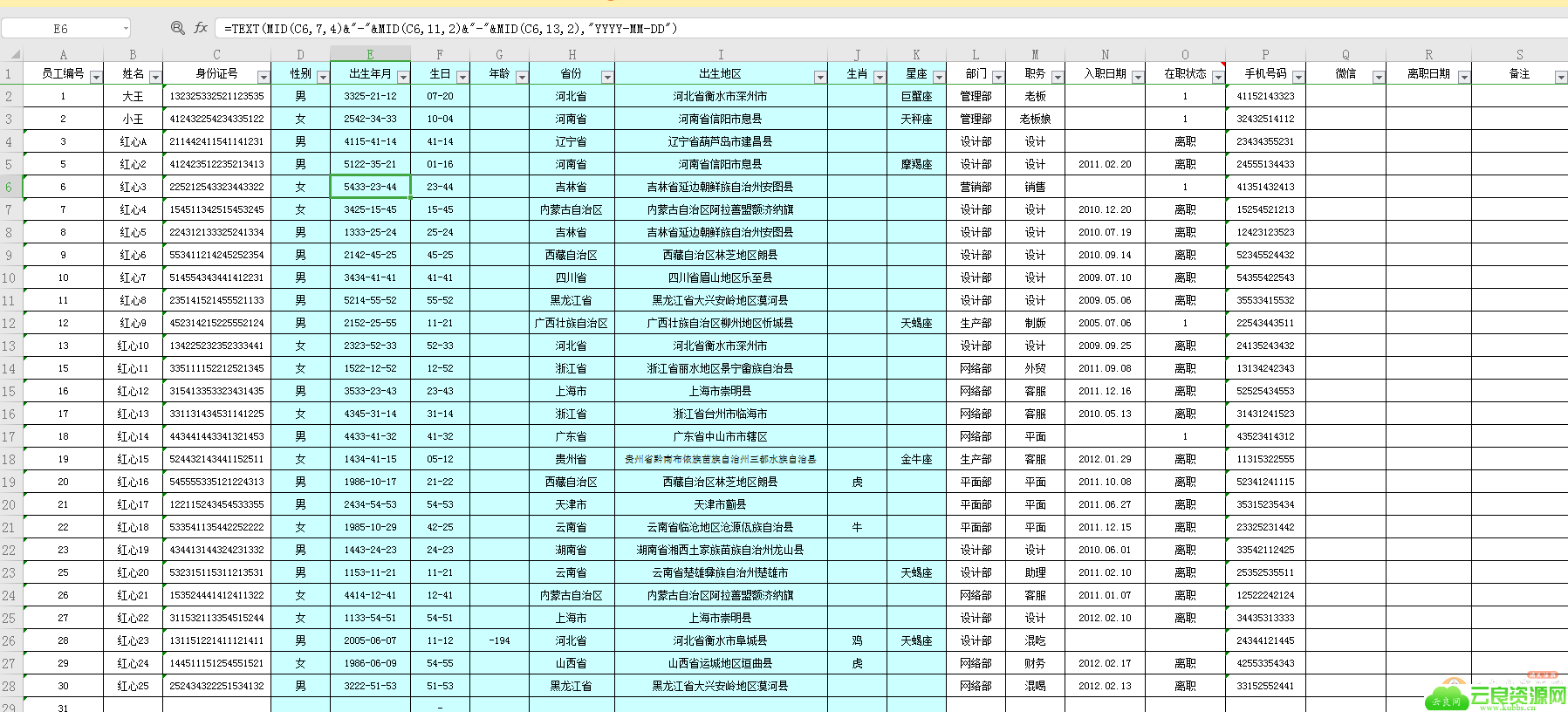 表内身份证号及手机号是我用公式自动生成的随机数字,下载后最好删除身份证号及手机号那两列的数据,不然会有点卡,会一直随机生成数字,