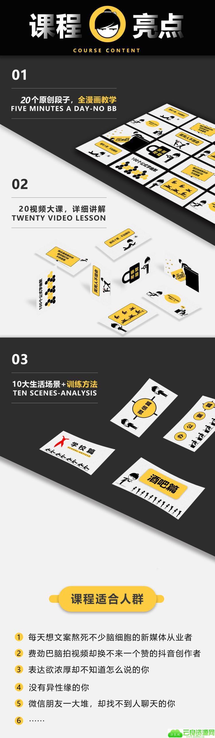 一堂可以让你短时间学会幽默的课程,20个原创段子全漫画教学;20个视频大课,详细讲解;10大生活场景+训练方法。